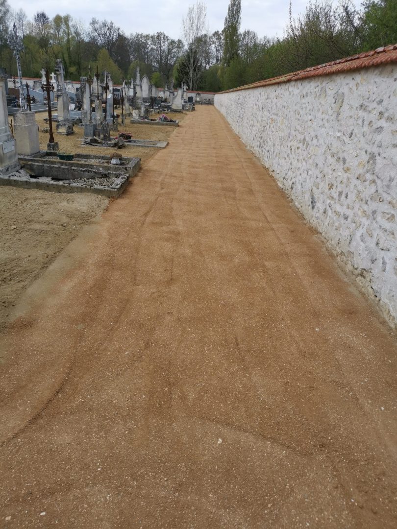 Dernièrement le cimetière a subi des modifications. Afin de respecter l’arrêté du 15 janvier 2021 qui étend l’application du zéro phyto aux cimetières et à la plupart des terrains de sport la commune s’est adaptée. Les allées ont été aménagées avec un géotextile recouvert d’un sable compactable. Ce choix permettra également l’accès aux handicapés. A l’extérieur du cimetière le crépi a été ôté pour faire place aux pierres apparentes, ainsi que le dépôt des déchets qui sera remplacé sous l’abri à l’intérieur par deux conteneurs. Les haies ont été arrachées, un nouvel aménagement paysager est à l’étude. Prochainement des bordures seront mises en place pour délimiter les parterres et des places de parking seront implantées.